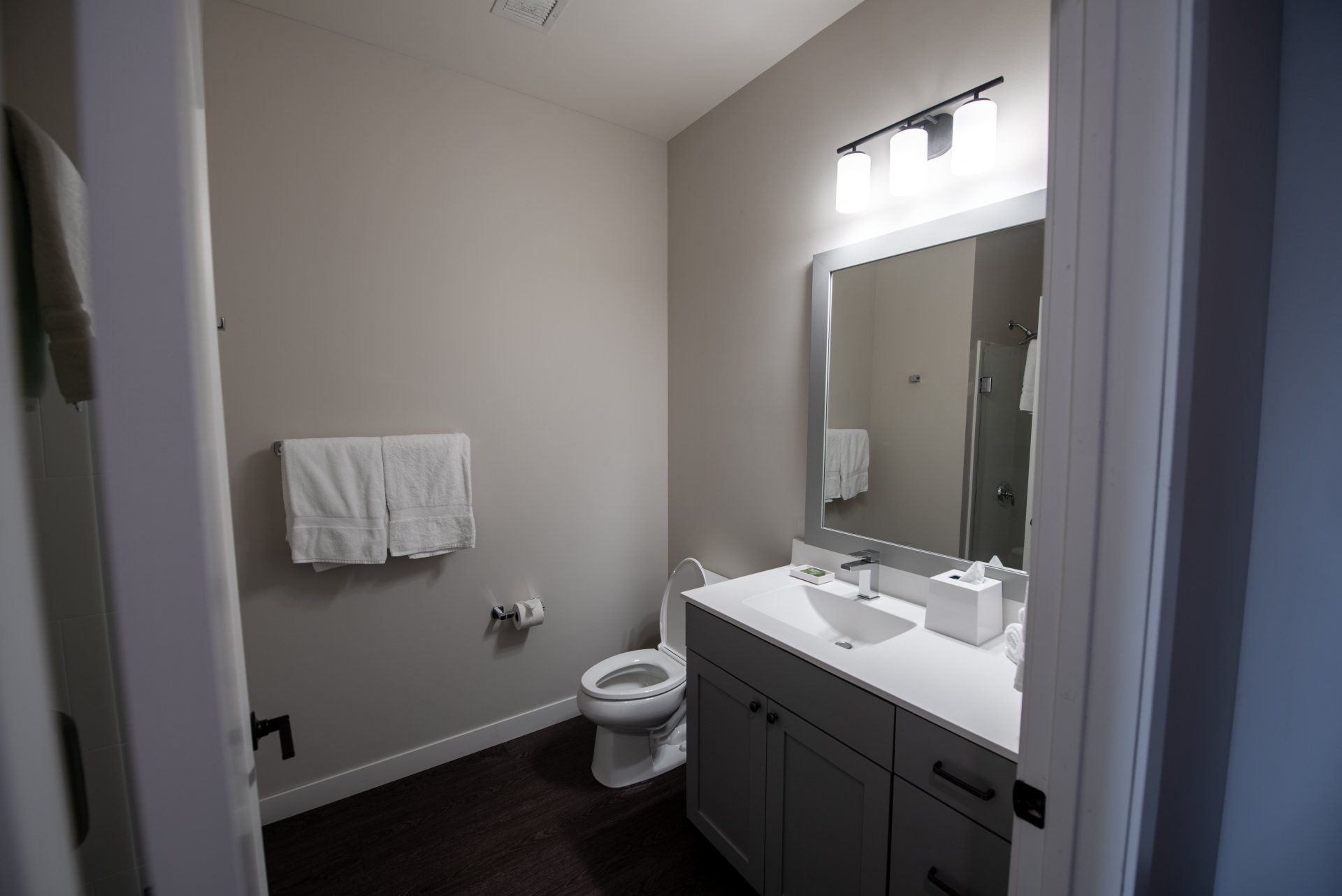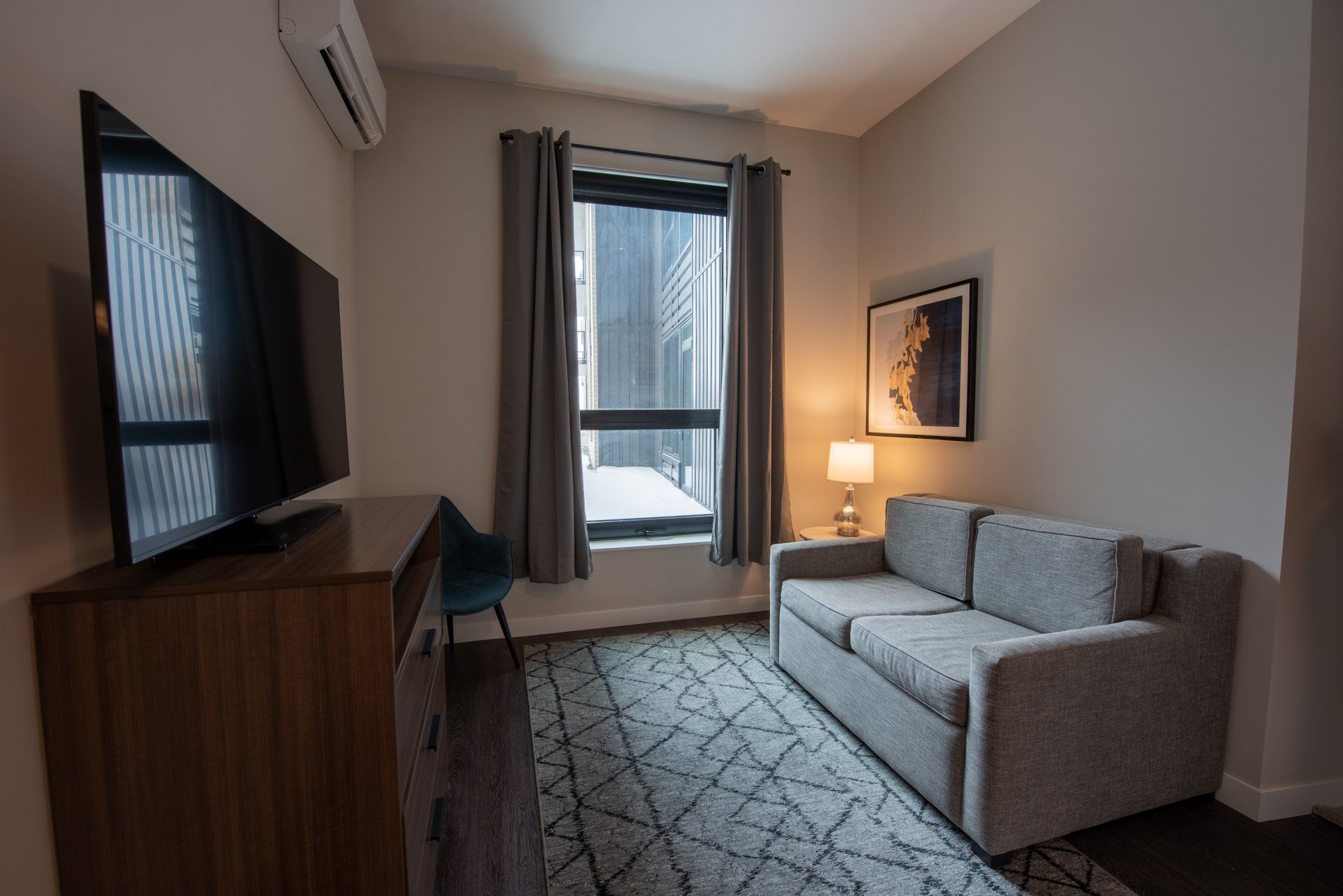 The Studio Suite offers a single room living space in an apartment style accommodation. The unit comes equipped with a fully stocked kitchen, dining space, in-unit washer/dryer, a queen sized bed and a 44 inch LED TV offering complimentary cable. The bathroom features a full vanity and either a walk-in shower or a shower/tub combination.